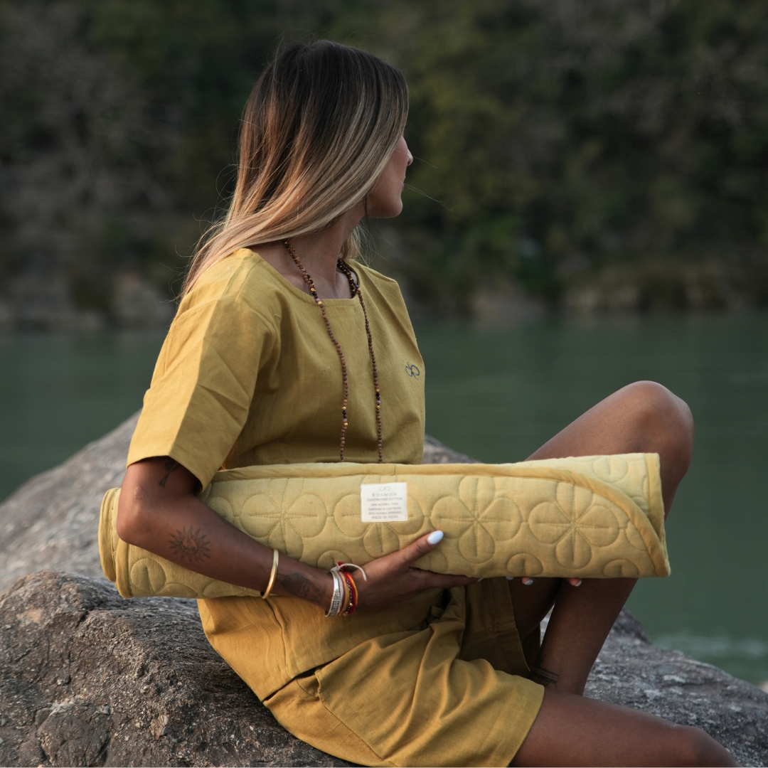 Kosmoh 'Anaar Chilka' herb-infused foldable Yoga & Meditation Mat - Sage Yellow, 100% Organic Handspun & Handwoven Khadi Cotton Yoga Mat I Sustainable & Eco-friendly