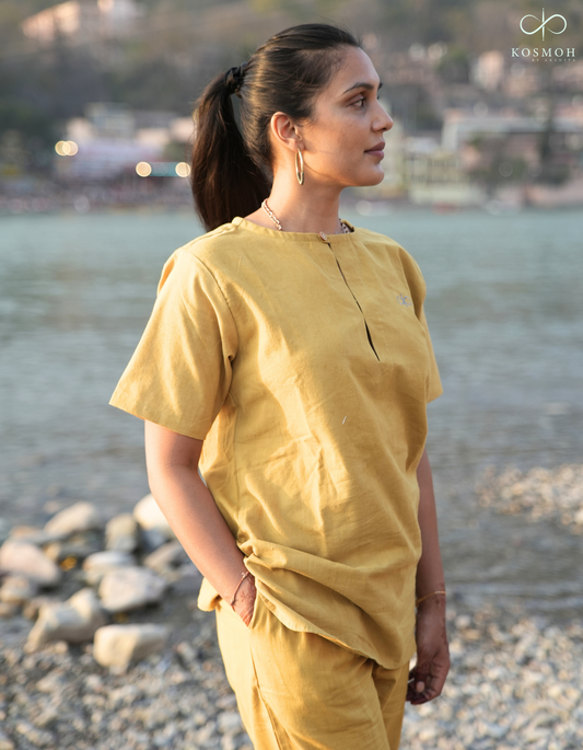 "Kosmoh 100% Organic KHADI Yoga Coord Set - Amber Yellow ( Set of top & yoga pants ) "