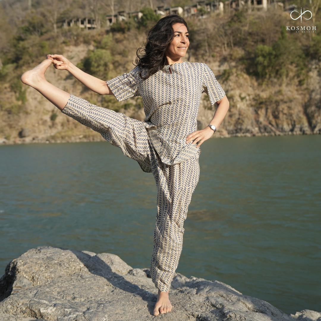 Embrace the timeless elegance of traditional craftsmanship with our Hand Block Print Pure Cotton Co-ord Set. Handmade in India, this set features authentic hand block printing, showcasing traditional motifs stamped by skilled artisans. Reviving a 5000-year-old tradition, this set blends the charm of traditional printing methods with contemporary designs. Crafted from 100% GOTS certified organic cotton, it offers a breathable and soothing feel on the skin, ensuring comfort and relaxation. The set includes a top and trouser designed for comfort and a relaxed fit, making it ideal for various activities such as yoga, sleep, travel, or simply lounging. Featuring wood buttons and deep crotch construction, the yoga top and pants set come with pockets and drawstrings, supporting flexibility in yoga poses. Feel good with Kosmoh, knowing that you're making a sustainable choice that reduces water consumption, saves resources, and supports women artisans' empowerment.